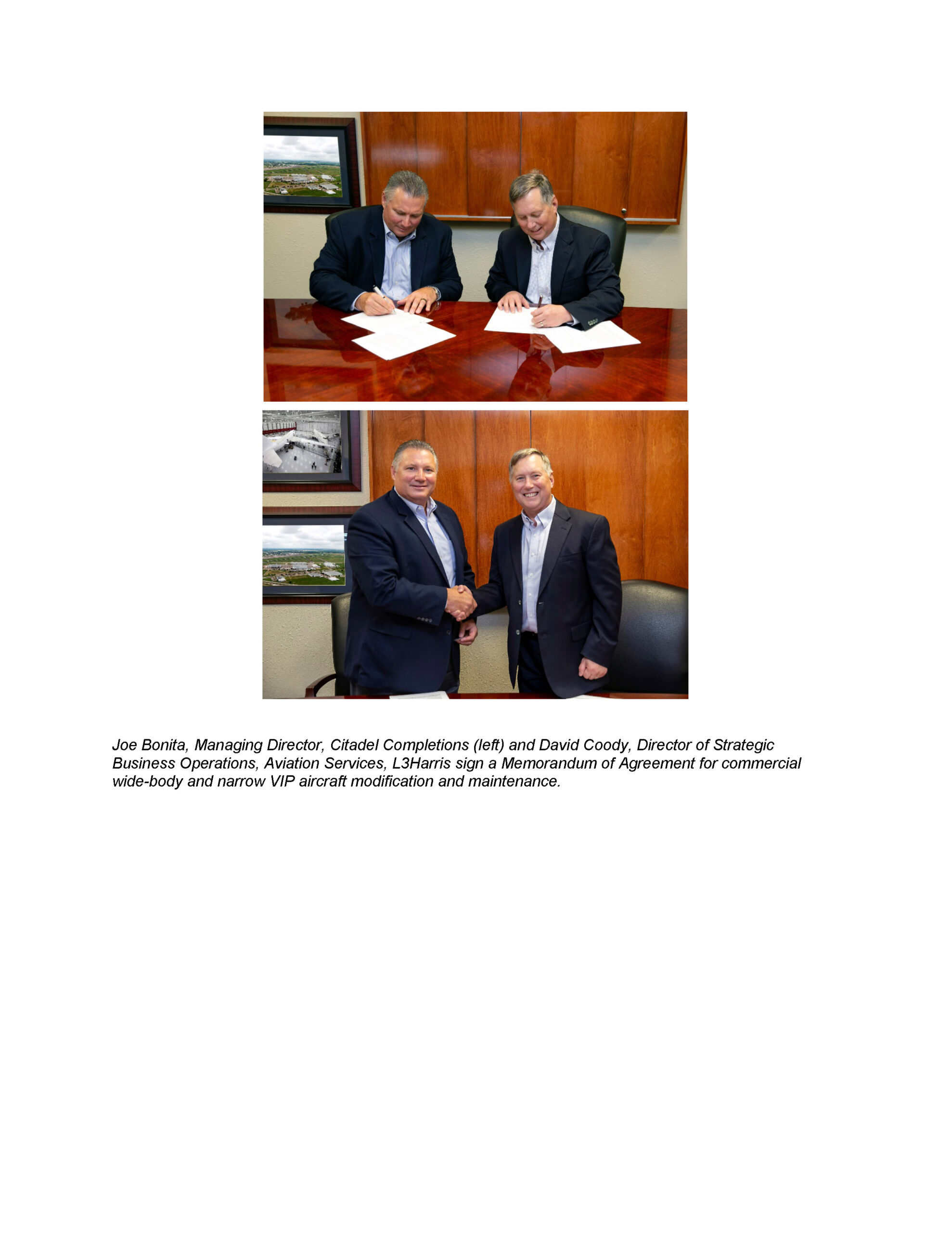 Joe Bonita, Managing Director, Citadel Completions (pictured left) and David Coody, Director of Strategic Business Operations, Aviation Services, L3Harris (right) sign a Memorandum of Agreement for commercial wide-body and narrow VIP aircraft modification and maintenance.